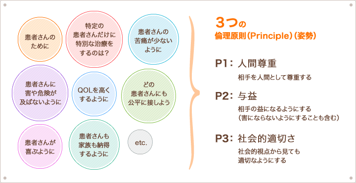 医療活動に携わっている時に、医療者はこれらの姿勢を体現しており、多くの倫理的姿勢に対して共通する倫理原則を体現しているはずです。もしそうでなければ、医療者は「医療」を行ってはいないからです。